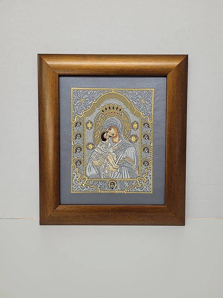 Icoana cu Fecioara Maria brodata cu fir metalic auriu si argintiu pe fond gri.